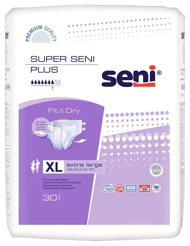 Подгузники для взрослых Super Seni Plus Extra Large - ночные подгузники с повышенным уровнем впитываемости для людей, страдающих средними и тяжелыми формами недержания. Предназначены как для активных людей, так и для людей с ограниченными двигательными возможностями. Наружный слой подгузника состоит из пропускающего воздух материала, который позволяет коже свободно дышать, что гарантирует высокий уровень комфорта и отсутствие раздражений и пролежней. Подгузники защищают кожу от влаги и позволяют содержать постель больного в чистоте. Обладают повышенным уровнем впитываемости. Входящий в состав впитывающего слоя антибактериальный абсорбент обеспечивает высокий уровень впитывания и предотвращение неприятного запаха.