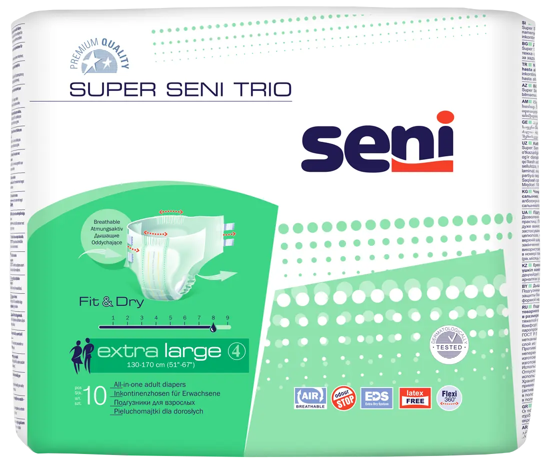 Подгузники Super Seni помогут деликатно и гарантированно решить проблемы, возникающие при энурезе. Предназначаются и для людей с ограниченными возможностями и для активных людей. Имеют гидрофобные боковые бортики, которые расположены внутри и создают дополнительную защиту от протекания. Подгузник снабжен индикатором влагонасыщения, помогающим вовремя определить наступление времени смены изделия. Сдавливания в области пояса помогает избежать эластичная резинка, которая обеспечивает комфортное прилегание к телу человека. В состав подгузников Super Seni входит дополнительный сдвоенный впитывающий слой, содержащий абсорбент высокого качества с антибактериальными свойствами. Он поможет избежать появления неприятных запахов и повысить уровень впитывания. Также по боковым сторонам подгузника расположены двойные эластичные липучки-застежки, позволяющие расстегивать и застегивать подгузник, не рискуя разорвать его внешний слой.