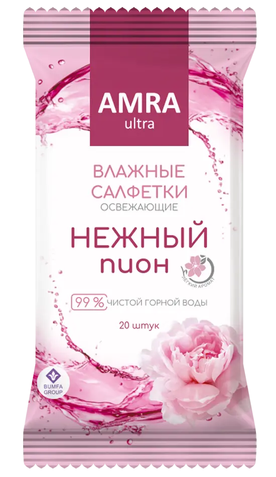 AMRA салфетки влажные освежающие с легким цветочным ароматом - это универсальное средство гигиены: освежают, очищают и увлажняют кожу. Состав пропитки на 99% состоит из горной ледниковой воды.