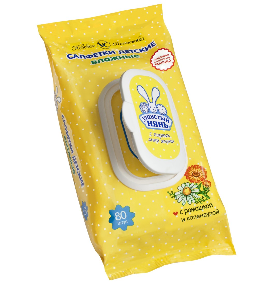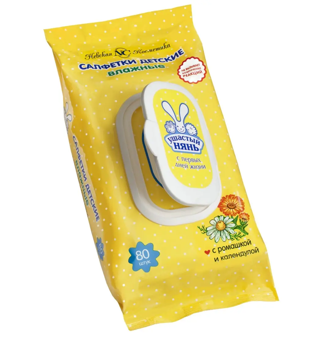 Влажные салфетки «Ушастый нянь» бережно очищают, увлажняют и освежают нежную кожу ребёнка с самого рождения. Содержат традиционно детские экстракты ромашки и календулы.Они изготовлены на основе натурального волокна повышенной плотности — мягкие, гигиеничные, хорошо впитывают, не рвутся и не вытягиваются. Оптимальный размер салфеток удобен для использования. Салфетки не содержат спирта, не сушат кожу, имеют рН, близкий к рН кожи ребенка. Гипоаллергенны.