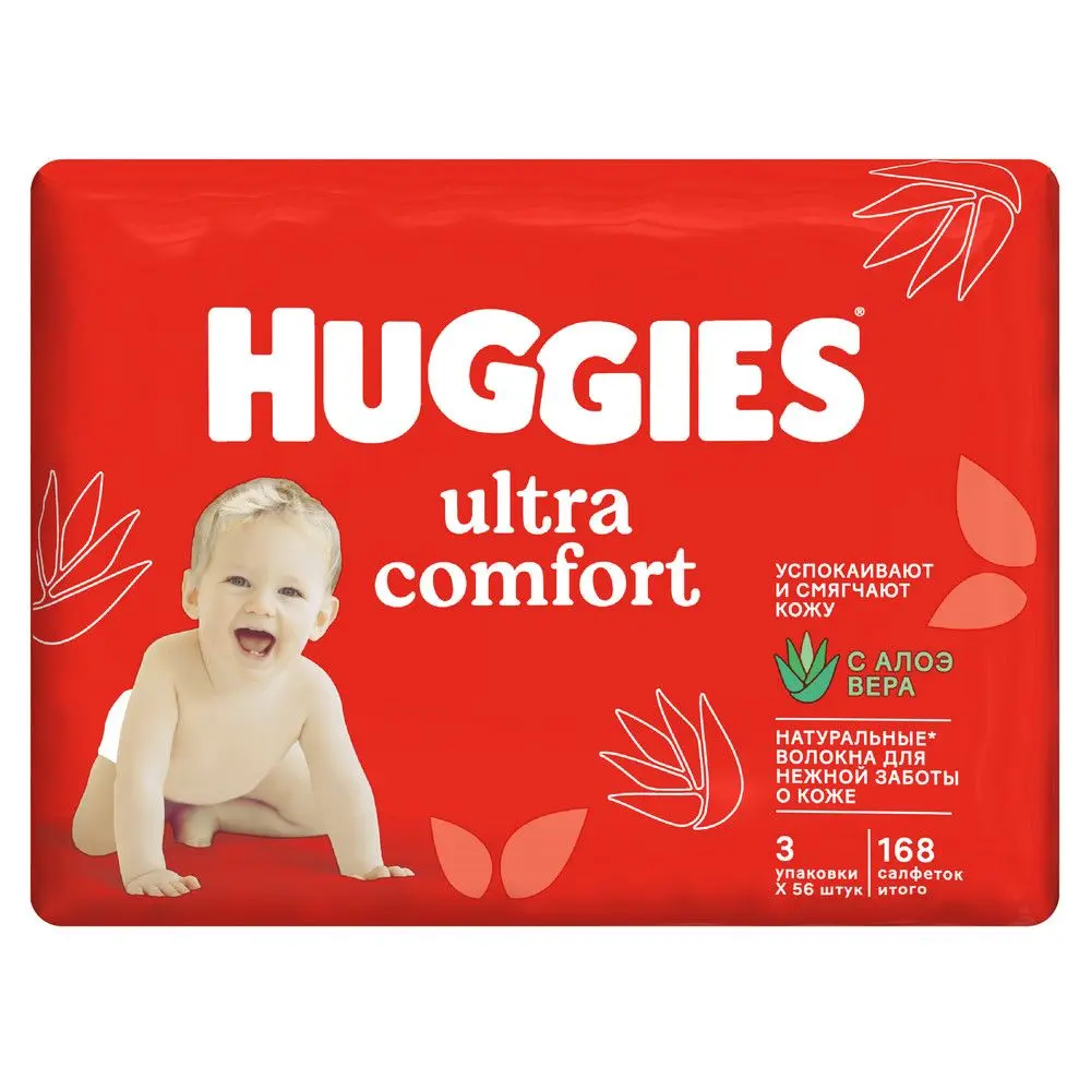 Влажные салфетки детские Huggies Ultra Comfort содержат натуральные волокна для нежной заботы о коже малыша. Благодаря экстракту алоэ вера в составе, гигиенические салфетки Хаггис Ультра Комфорт не только прекрасно очищают кожу от загрязнений, но и успокаивают и смягчают ее. Влажные салфетки для детей Huggies Ultra Comfort Aloe помогут вам с легкостью очистить кожу ребенка в любых условиях: дома, на прогулке или в поездке. В состав новых влажных салфеток Хаггис Ультра Комфорт входит Алоэ и витамин E для нежного и успокаивающего ухода и защиты. Очищающие салфетки Huggies Ultra Comfort с алоэ созданы по технологии «3 слоя чистоты»: 3 плотных впитывающих слоя с натуральными материалами и пропиткой из очищенной воды. Улучшенный клапан открывания для сохранения влажности салфеток. Не содержит парабенов. Не содержит спирт. Пропитка PH сбалансирована. Влажные салфетки детские Huggies Ultra Comfort пышные, прочные и при этом очень нежные! Упаковкой влажных салфеток Хаггис Ультра Комфорт 168 штук удобно пользоваться дома. Пожалуйста, оставьте отзыв – Ваше мнение важно для нас!