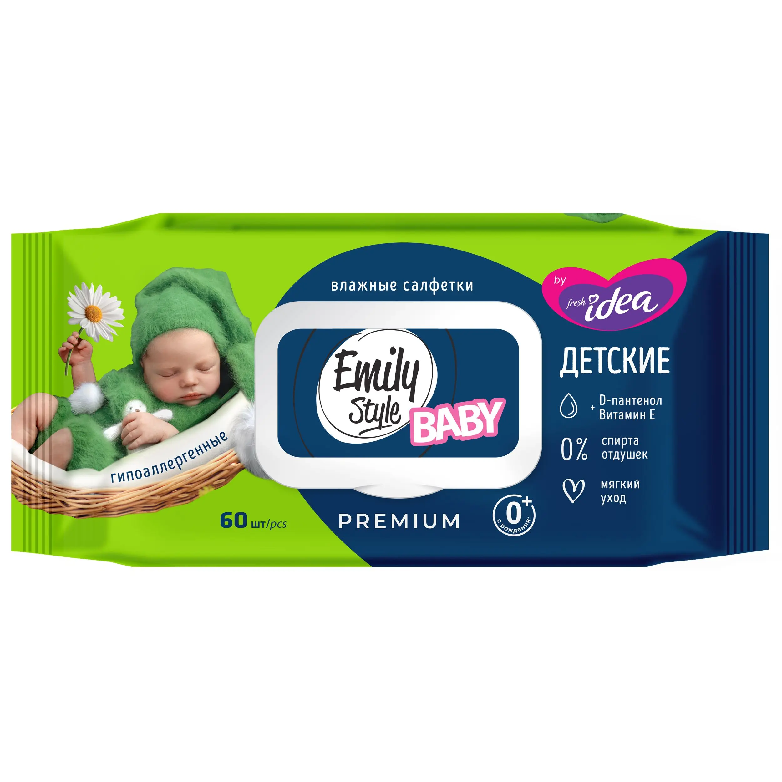 Emily Style премиум влажные салфетки детские гипоаллергенные без отдушки с крышкой 0+* зел гол 60 шт