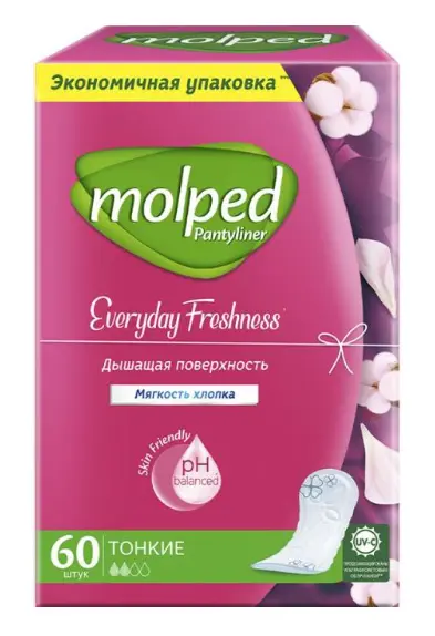 Ежедневные прокладки, Molped, подарят ощущение свежести на весь день. Тонкие, дышащие, с приятным на ощупь покрытием. Экономичная упаковка: 60 прокладок. Степень защиты: 2/4.