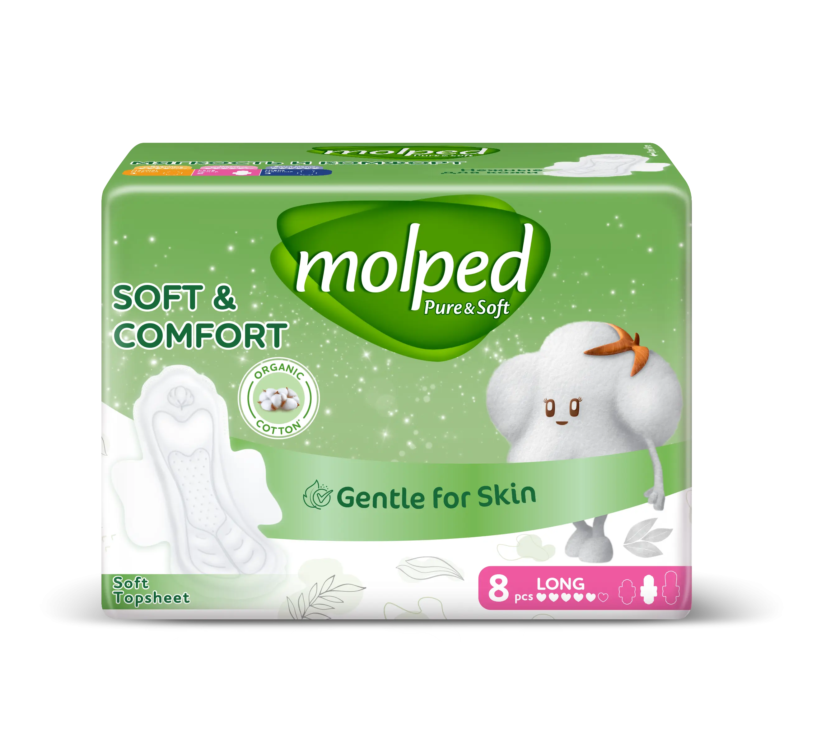 Женские ультратонкие гигиенические прокладки с крылышками Molped Pure Soft super. Не ароматизированные. Мягкая хлопковая поверхность: Обновленный мягкий верхний слой. Дышаший верхний слой, который позволяет вашей коже чувствовать себя комфортно в течение всего дня Защита от протекания: Новая форма с защитой от протекания идеально подходит для вашего белья. Новая синяя защитная зона немедленно впитывает влагу. Максимальная сухость в течение всего дня Идеальное крепление: Новые широкие крылышки прочно закрепляют прокладку на вашем белье. Максимальная уверенность благодаря уникальной форме, которая подходит вашему телу.