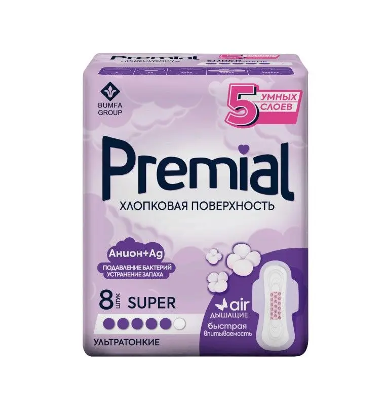 Premial прокладки женские гигиенические с крылышками super wings хлопковая поверхность 8 шт
