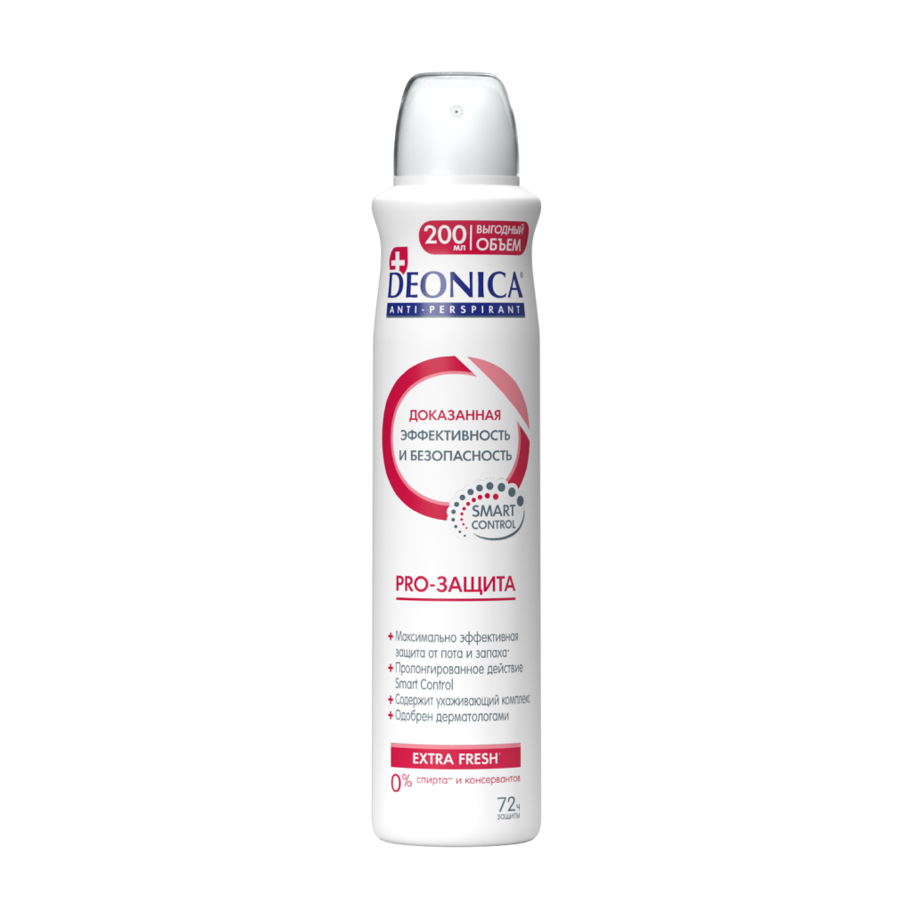 Современный антиперспирант DEONICA PRO-ЗАЩИТА содержит комплекс антибактериальных, противомикробных и противовоспалительных компонентов и обеспечивает максимальную защиту* от пота и запаха в течение 72 часов.