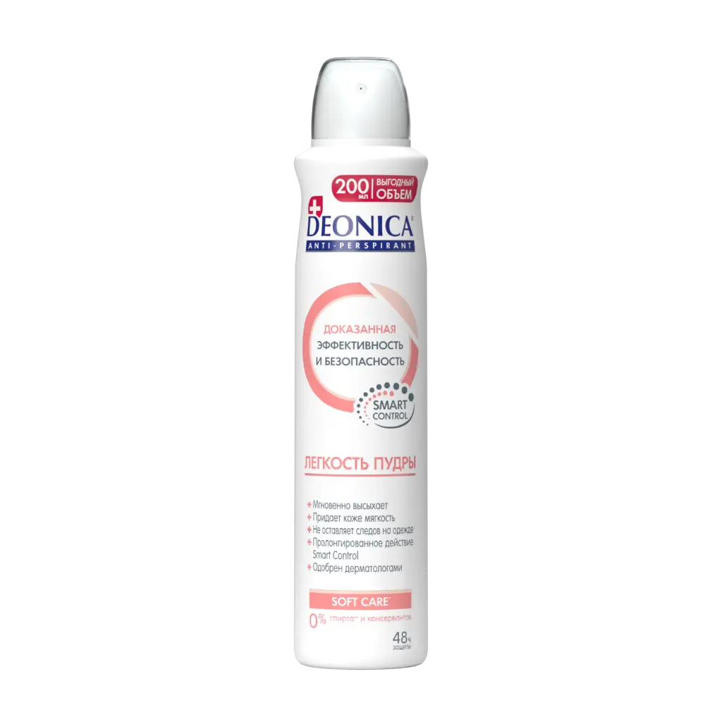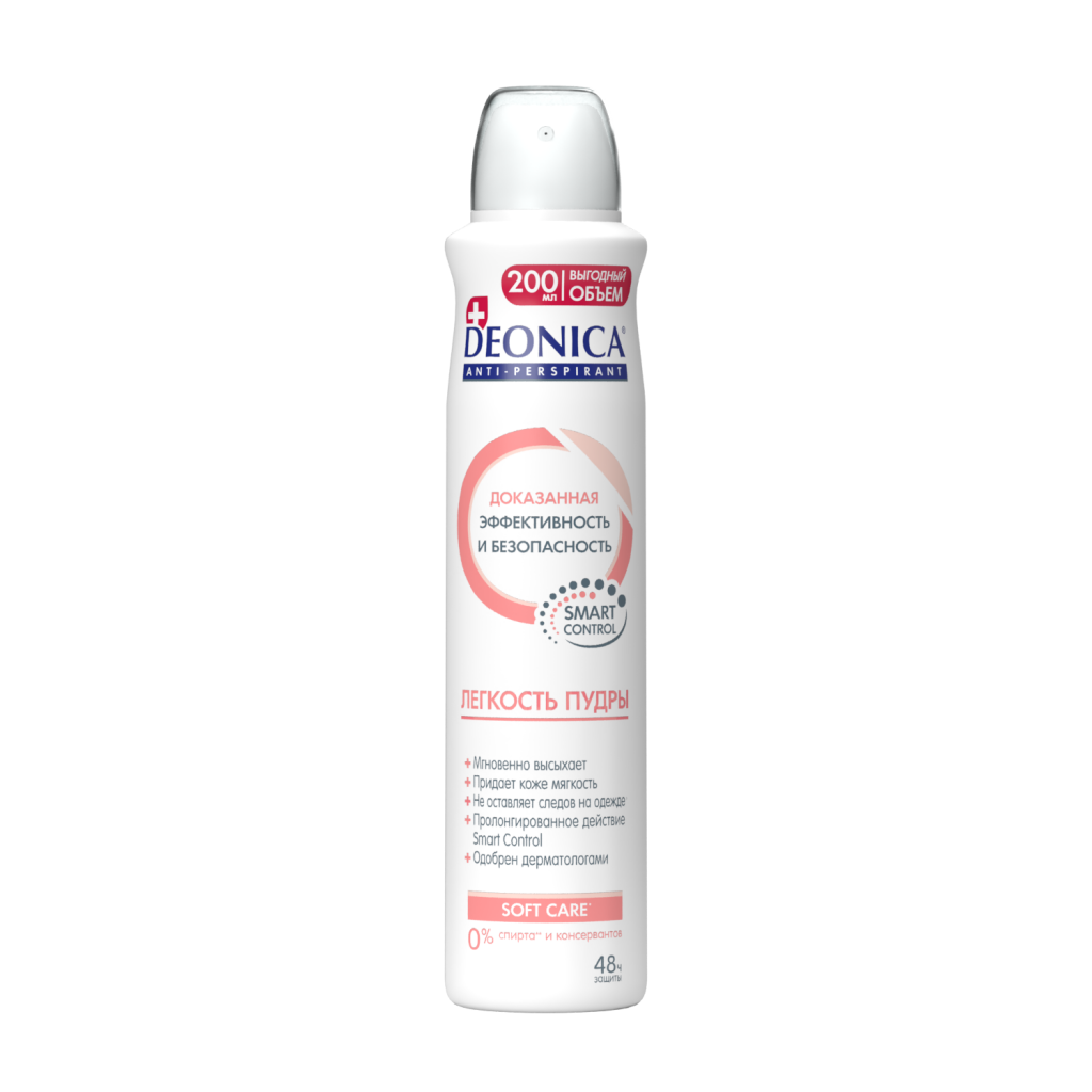 Уникальный антиперспирант DEONICA ЛЕГКОСТЬ ПУДРЫ благодаря специальной формуле мгновенно высыхает, не оставляя ощущения липкости, придает коже невероятную мягкость и обеспечивает надежную защиту от пота и запаха на 48 часов.