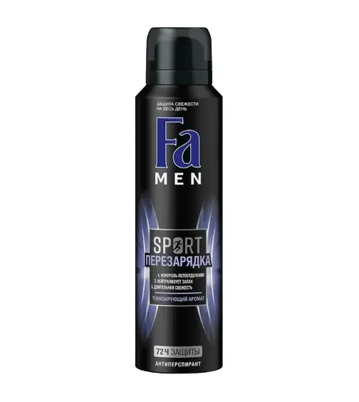 Дезодорант-аэрозоль Fa Men Sport Перезарядка, 150мл. - 72 часа защиты от пота. - Борется с запахом пота, вызываемым бактериями. - Бодрящий аромат восстановить силы после занятий спортом. - 0% спирта.