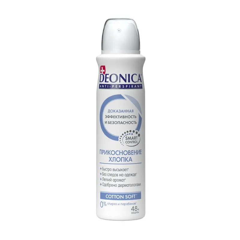 Деликатный антиперспирант DEONICA Прикосновение хлопка содержит специальную формулу с комплексом Аллантоина и Сквалана, компоненты которого оказывают успокаивающее, смягчающее действие, способствуют повышению устойчивости эпидермиса к внешнему воздействию и обеспечивают надежную защиту до 48 часов.