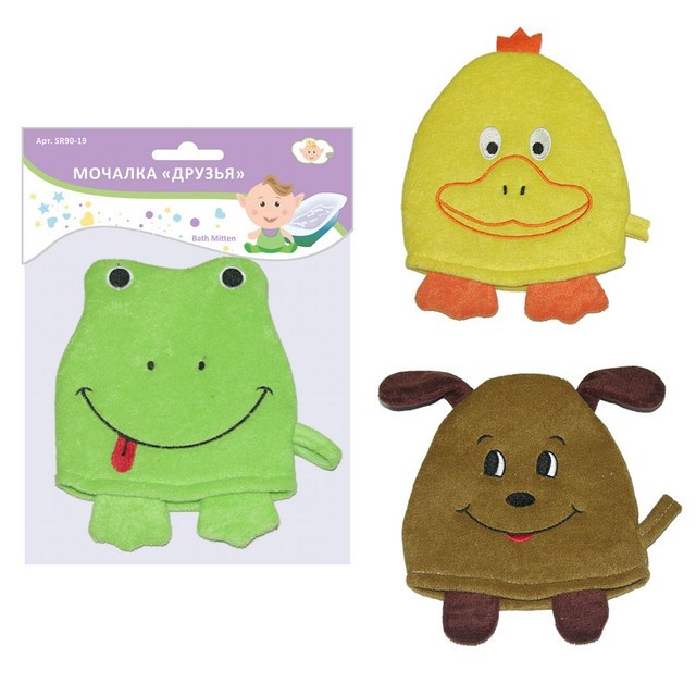Прикосновение мягкой махровой ткани комфортно для чувствительной кожи ребенка, при этом ткань хорошо намыливается и нежно массирует.В качестве наполнителя используется губка из вспененного полимерного материала.Веселая мочалка с изображением забавных животных понравится вашему малышу и украсит интерьер ванной комнаты.