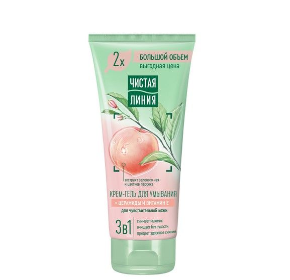 Добавьте в ежедневный уход новую усиленную формулу для комфорта вашей кожи°! Крем-гель для умывания Чистая Линия 3 в 1 с церамидами и витамином Е разработан с учетом потребностей чувствительной кожи. Он не только бережно снимает макияж', но и очищает без сухости, придает здоровое сияние благодаря активным ингредиентам в его составе. • Церамиды уменьшают излишнюю чувствительность и восстанавливают эластичность. • Витамин Е, известный своим антиоксидантным действием, успокаивает кожу, снижает покраснения. • Экстракт зеленого чая, благодаря содержанию полифенолов, нейтрализует свободные радикалы, которые ускоряют процесс старения, а также увлажняет и смягчает кожу. • Экстракт персика увлажняет и тонизирует кожу, возвращает ей упругость и тонус. Раскрывает сияние и разглаживает морщины, питает и смягчает кожу, делает ее бархатистой, эластичной и упругой. Успокаивает и предотвращает шелушение. Крем-гель для умывания Чистая Линия представлен в выгодном объеме 200 мл'', которого хватит надолго.