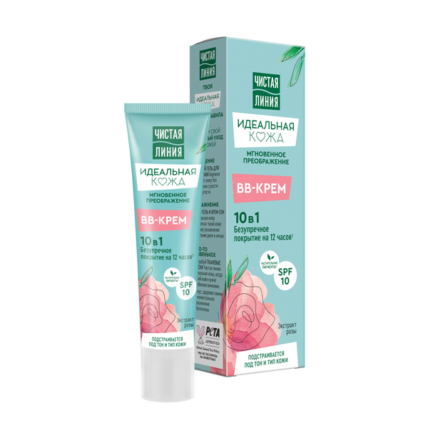 Восхищайте ровным и сияющим тоном лица с кремом 10 в 1 Идеальная кожа от бренда Чистая Линия. Его невесомая текстура со светоотражающими частицами мгновенно преображает кожу. Средство ровно ложится, не создавая эффект маски. Экстракт розы увлажняет и улучшает цвет лица. Растительные1 и минеральные пигменты выравнивают тон и матируют. Всего один продукт, который векторно воздействует на кожу: • Увлажняет и питает на 24 часа2. • Скрывает несовершенства. • Матирует кожу на весь день. • Придает сияние и отдохнувший вид. • Делает поры менее заметными. • Создает безупречное покрытие на 12 часов2. • Защищает от UV-лучей благодаря SPF 10. • Подстраивается под любой тип и тон кожи. • Препятствует негативному влиянию окружающей среды. Свойство продукта подтверждены в ходе потребительского тестирования2. Так, 93% респондентов отметили, что крем идеально подстраивается под тон кожи и мгновенно выравнивает тон; 97% – скрывает несовершенства без эффекта маски и границ нанесения, не подчеркивает шелушение; 99% – при нанесении крем не скатывается на коже, ровно ложится, не забивает поры, мгновенно делает их менее заметными. ВВ-крем некомедогенен и одобрен дерматологами.