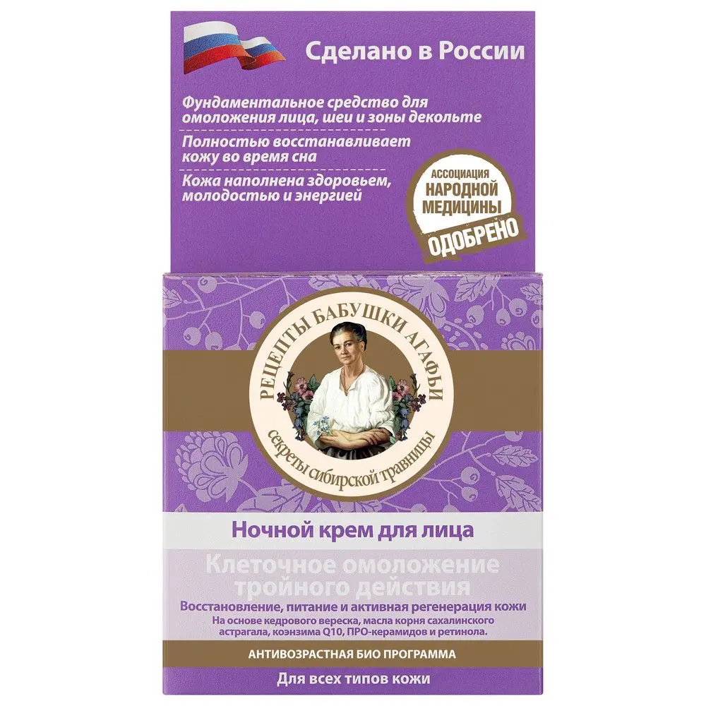 Ночной крем для лица тройного действия созданный по рецептам сибирской травницы Агафьи, эффективно действует на клеточном уровне и восстанавливает кожу во время сна, обеспечивая ее активное питание и регенерацию. Кедровой вереск содержит большое количество органических кислот и дубильных веществ, благодаря чему он прекрасно тонизирует и освежает кожу. Масло корня сахалинского астрагала богато эфирными маслами, флавоноидами и органическими кислотами. Оно успокаивает и смягчает кожу, освобождает ее от накопленного за день напряжения. Коэнзим Q10+ восстанавливает и омолаживает кожу во время сна, придает ей упругость и эластичность. ПРО-керамиды и ретинол глубоко питают и разглаживают кожу, сокращая глубокие и мелкие морщины.
