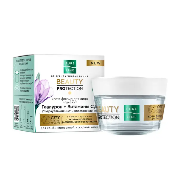 Откройте новый уровень комфорта' вашей кожи и активируйте естественные механизмы ее защиты с Pure Line от бренда Чистая Линия! Гипоаллергенный крем-флюид разработан с учетом всех потребностей жирной и комбинированной кожи. Невесомая тающая текстура легко впитывается и не оставляет жирной пленки. В составе продукта: • Гиалуроновая кислота интенсивно увлажняет, сокращает трансэпидермальную потерю влаги; • Витамины С и Е оказывают антиоксидантное действие, помогают устранить раздражение и шелушение; • Комплекс 7 CITY CARE 100% натурального происхождения с активом центеллы азиатской и растительными пребиотиками защищает от воздействия загрязнений окружающей среды и обеспечивает 7 преображающих эффектов: сияющая кожа, меньше признаков раздражения, баланс микробиома, сохранение упругости, комфорт, дополнительное увлажнение, восстановление. Уже после первого применения вы заметите результат*: ощущение комфорта без раздражения, кожа более упругая и увлажненная, она выглядит отдохнувшей и свежей, меньше жирного блеска. Позаботьтесь о природе вместе с нами!