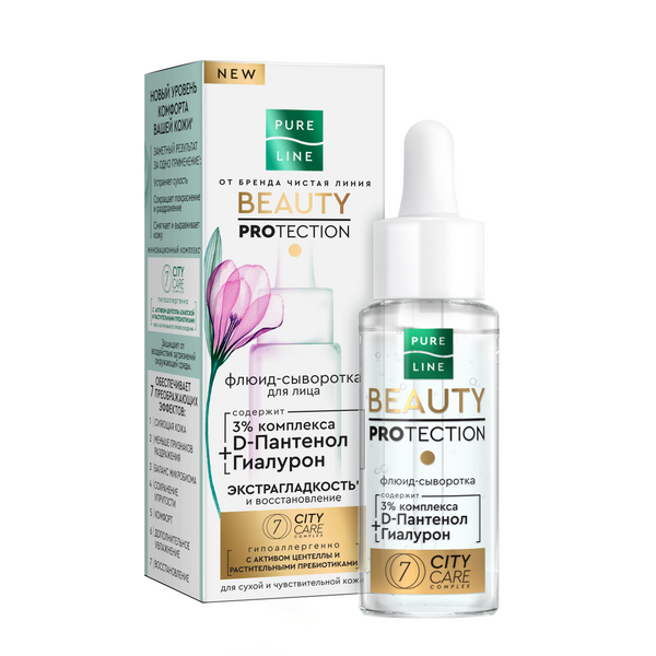Запустите естественные механизмы защиты кожи на новом уровне комфорта' с Pure Line от бренда Чистая Линия! Гипоаллергенная флюид-сыворотка создана специально для сухой и чувствительной кожи. Питательная флюиднаяя текстура легко наносится и впитывается, не оставляя следов. Ультрапитательная формула' содержит специально отобранные активные компоненты и эффективно воздействует на кожу уже после первого применения!* Вы заметите*: сухость устранена, сокращены покраснение и раздражение, кожа смягчена и выровнена. • D-пантенол сохраняет упругость и эластичность кожи, устраняет сухость, смягчает и восстанавливает. • Гиалуроновая кислота интенсивно увлажняет, сокращает трансэпидермальную потерю влаги. • Комплекс 7 CITY CARE - 7 СИТИ КЕА 100% натурального происхождения с активом центеллы азиатской и растительными пребиотиками защищает от воздействия загрязнений окружающей среды и обеспечивает 7 преображающих эффектов: сияющая кожа, меньше признаков раздражения, баланс микробиома, сохранение упругости, комфорт, дополнительное увлажнение, восстановление. После того как используете флюид-сыворотку, отправьте флакон в контейнер для пластика или вторсырья. Он пригоден для переработки.