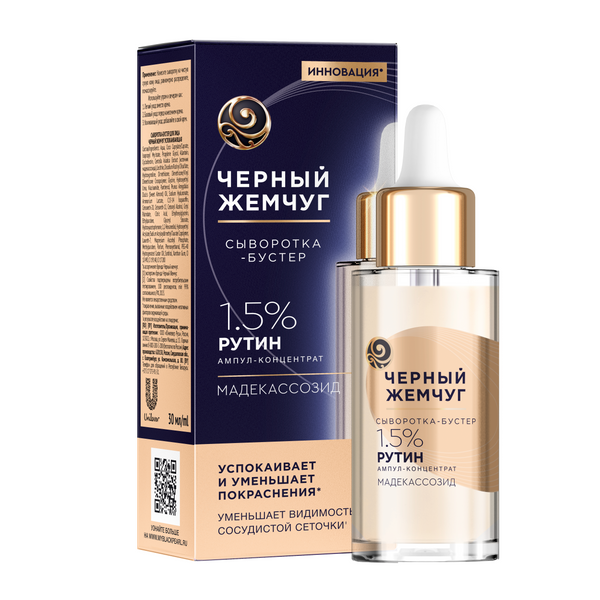 Для качественного ежедневного ухода за кожей попробуйте инновационную*успокаивающую сыворотку-бустер Черный Жемчуг. Она разработана экспертами бренда совместно с косметик-эстетистами для ежедневного комплексного ухода за кожей лица. Средство подходит для женщин и мужчин с разными типами кожи, включая чувствительную. Преимущества: • Тонизирует кожу, заметно уменьшает покраснения** и видимость сосудистой сеточки'; • Нормализирует состояние кожи и усиливает ее защитные функции; • Обладает антиоксидантными свойствами; • Повышает упругость, эластичность кожи; • Успокаивает, снимает дискомфорт и раздражение, восстанавливает защитный барьер кожи; • Мгновенно впитывается без ощущения липкости. Активные действующие компоненты: Рутин ампул-концентрат в высокой концентрации 1,5% уменьшает покраснения**; Мадекассозид восстанавливает кожу, повышает упругость. Почувствуйте усиленный эффект при использовании программы ухода