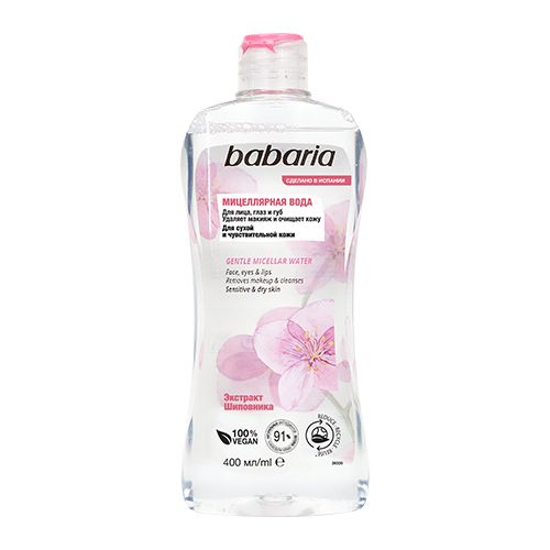 Мягкая мицеллярная вода Babaria. Легко удаляет косметику и загрязнения, не требует смывания. В состав входит смягчающий компонент. Экстракт шиповника богат витаминами, оказывает антиоксидантное действие, увлажняет, питает и восстанавливает сухую кожу, укрепляет естественный барьер и нормализует гидролипидный баланс. Предназначена для снятия макияжа с лица, глаз и губ без дополнительного трения.Мицеллярная вода подходит для сухой и чувствительной кожи. На 91% состоит из натуральных ингредиентов.