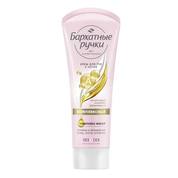 Встречайте обновленный крем от бренда Бархатные ручки с обновленным дизайном, новыми ароматами' и усиленными формулами'! Нежная кожа рук нуждается в ежедневной заботе и качественном уходе. Доверьте заботу о своих руках бренду №1* в уходе за руками – Бархатные ручки! Комплексный крем Бархатные ручки позаботится о нежной коже рук и продлит красоту маникюра. • Формула с минеральным комплексом и витаминами А и Е обеспечивает увлажнение кожи рук, смягчает кутикулу и способствует укреплению ногтей. • Комплекс масел интенсивно увлажняет, смягчает, предотвращает появление сухости. Аллантоин оказывает смягчающее и увлажняющее действие на кожу. Масло ши восстанавливает защитный барьер. • Текстура комплексного крема быстро впитывается, не оставляет липкости и жирной пленки. Ежедневно наносите крем для рук не менее 2 раз, чтобы предотвратить появление сухости кожи и продлить красоту маникюра. Свежий цветочный аромат с фруктовыми нотами создаст особое настроение во время нанесения.