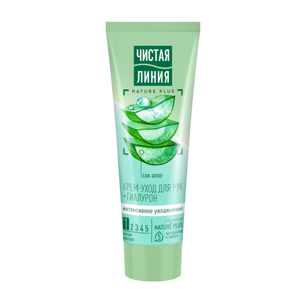 Встречайте крем для рук от Чистой Линии с усиленной формулой1 и в обновленном дизайне! Проблемы сухой и шероховатой кожи рук решит крем-уход Интенсивное увлажнение Сок алоэ от бренда Чистая Линия. В составе продукта 97% компонентов натурального происхождения*. Крем содержит эссенцию из пяти экстрактов и масел NATURE PLUS (экстракты вербены и пиона, масла миндаля, льна, оливы), сок алоэ и гиалурон. Благодаря эффективной формуле крема кожа получает увлажнение в течение 24 часов2. Активные натуральные компоненты глубоко3 увлажняют кожу рук, придавая ей мягкость и гладкость. - Экстракт вербены восстанавливает баланс увлажненности и тонизирует. - Экстракт пиона и льняное масло успокаивают и смягчают. - Масло миндаля содержит жирные кислоты, витамины Е и F, питает и выравнивает поверхность кожи. - Ферментированное оливковое масло богато природными антиоксидантами, питает и помогает предотвратить преждевременное старение кожи. - Гиалурон притягивает молекулы воды и создает на поверхности кожи невидимую вуаль, благодаря чему происходит насыщение влагой. - Сок алоэ интенсивно увлажняет кожу и помогает ей удерживать влагу.