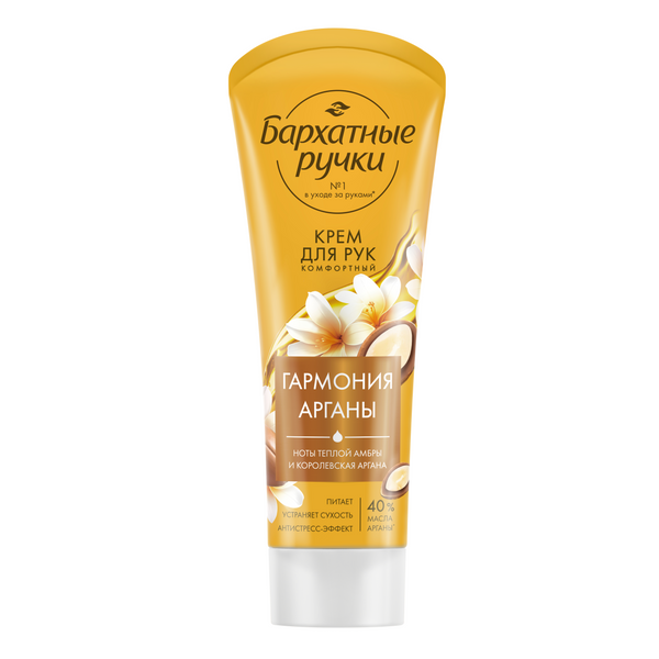 Добавьте в свой ежедневный уход новинку от бренда №1 в уходе за руками° – крем для рук Бархатные ручки Королевская аргана. Его плотная питательная текстура содержит 40% масла арганы', а также масла ши, миндальное, виноградной косточки. Масло арганы – мощный природный антиоксидант, обладает анти-стресс действием и, как источник ненасыщенных жирных кислот, обеспечивает восстановление барьерной функции кожи. Благодаря своему насыщенному сбалансированному составу крем эффективно питает и устраняет сухость. Крем имеет приятный аромат, пирамида которого стартует нотами сладкого мандарина, переходящими в аккорды загадочного жасмина и розы. База аромата – амбра и пачули. Пользуйтесь кремом для рук Королевская аргана каждый день и наслаждайтесь эффектом и роскошным ароматом восточной направленности.