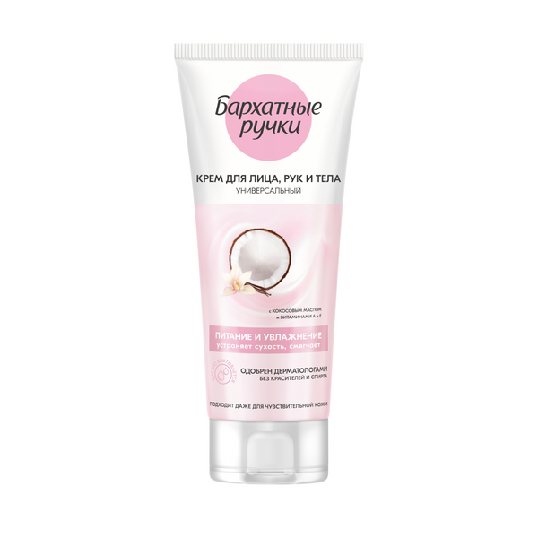 Для ухода за кожей лица, тела и рук попробуйте новинку от бренда Бархатные ручки – крем Универсальный Питание и увлажнение с маслом кокоса и витаминами А и Е. • Кокосовое масло увлажняет и питает, устраняет сухость, делая кожу мягкой и гладкой. • Витамины А и Е восстанавливают гладкость, тонизируют и придают коже естественное сияние. Витамин Е – мощный антиоксидант, поддерживающий собственные защитные функции кожи, а витамин А способствует восстановлению и сохранению ее упругости и эластичности. • Не содержит красителей и спирта. • Нежная текстура крема быстро впитывается без жирности и липкости. • Универсальная формула подходит даже для чувствительной кожи. Формула универсального крема эффективно увлажняет, питает и восстанавливает кожу лица, тела и рук. А это значит, что можно использовать один продукт, не загромождая туалетный столик различными кремами. Продукт прошел клинические испытания и одобрен дерматологами. Объем 200 мл удобен в использовании и будет всегда под рукой. Откройте для себя все секреты нежности с обновленной коллекцией кремов Бархатные ручки: невероятно притягательные ароматы, различные текстуры от нежных до супернасыщенных и по-прежнему эффективные составы. Доверьте красоту и уход за кожей экспертам бренда №1* по уходу за руками – Бархатные ручки.