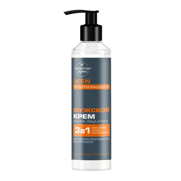 Встречайте долгожданную новинку, разработанную экспертами бренда Бархатные ручки специально для мужчин, – крем для рук, лица и тела 3 в 1! Идеальное решение, когда нужен качественный мультифункциональный крем. Продукт содержит Д-пантенол и витамин С, мгновенно впитывается без липкости и жирности, увлажняет и устраняет сухость. Может быть использован как крем после бритья, как крем для тела и рук.