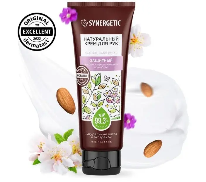 Натуральный крем для рук SYNERGETIC "Защитный" идеально подходит для ежедневного ухода и защиты нежной кожи рук. Натуральный пребиотик и природный антиоксидант трегалоза нормализует и сохраняет естественный микробиом кожи. Бисаболол успокаивает и помогает восстановить барьерные функции кожи, снимает раздражения и покраснения, повышает эластичность и упругость, способствует более глубокому проникновению активных веществ в глубокие слои кожи. Масла карите и сладкого миндаля питают и защищают кожу от негативного воздействия окружающей среды. Экстракты асаи и вербены стимулируют обновление клеток, способствуя омоложению кожи, а шалфей увлажняет и тонизирует, снимает воспаления и раздражения, придает крему приятный аромат. Благодаря нежной текстуре средство легко наносится и равномерно распределяется по коже, хорошо впитывается и дарит ощущение мягкости и комфорта.