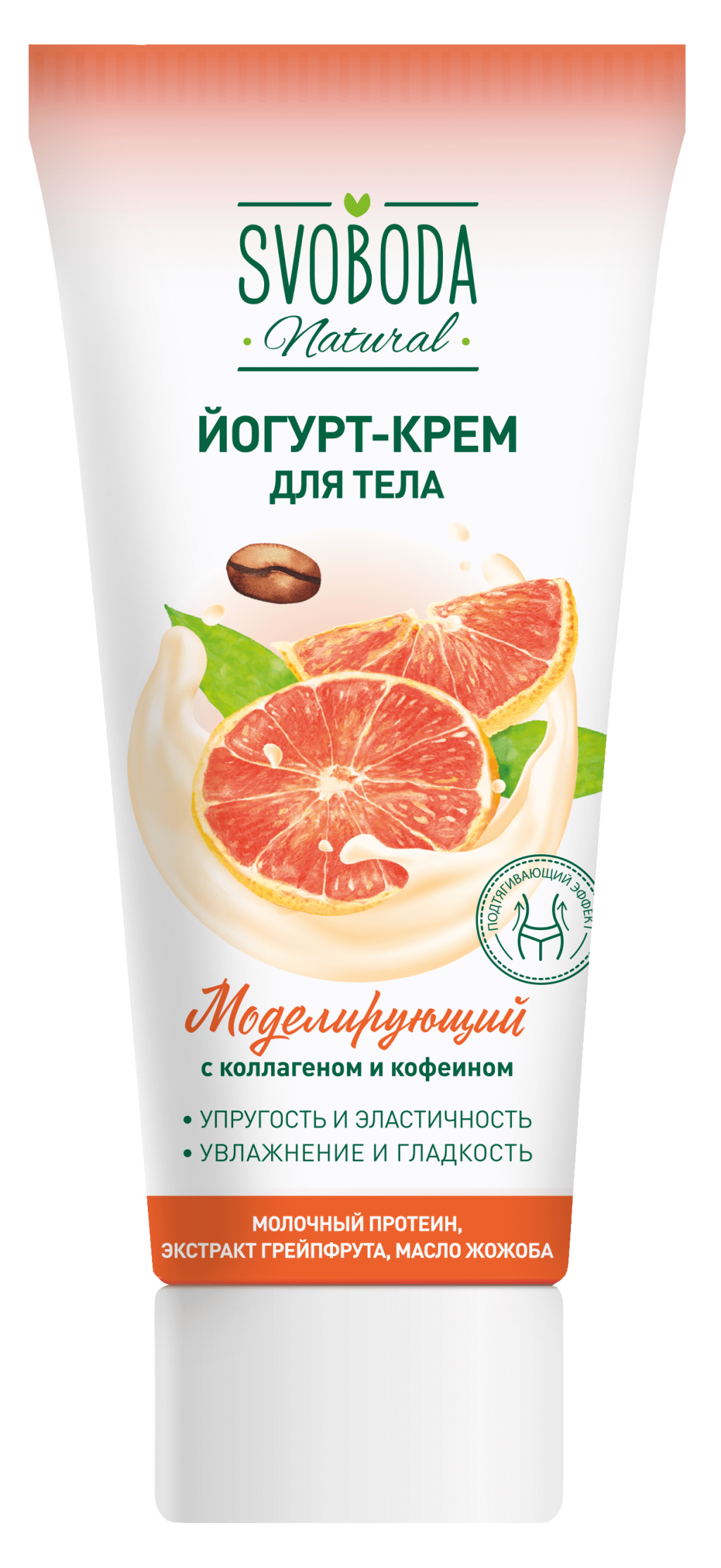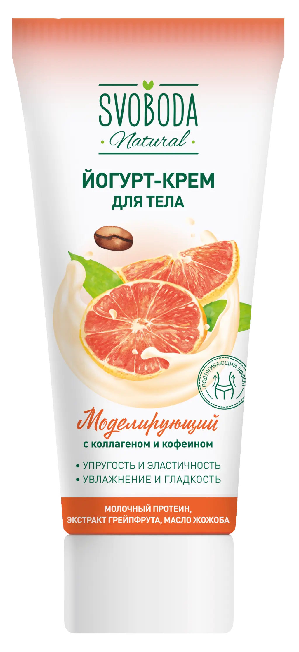 Йогурт-крем для тела ухаживает за кожей, повышая ее тонус, упругость и эластичность, придавая гладкость и сияние. При регулярном применении кожа становится более увлажнённой и подтянутой. В составе йогурт-крема коктейль эффективных ингредиентов:Коллаген и эластин омолаживают и регенерируют кожу.Молочный протеин и бетаин активно увлажняют, придают коже мягкость и гладкость.Кофеин обладает липолитическим эффектом, активизирует обменные процессы.Экстракт грейпфрута освежает и повышает тонус кожи.Масло жожоба защищает кожу от негативного воздействия окружающей среды.Моделирующий комплекс дает выравнивание и укрепление структуры кожи, повышает выработку собственного коллагена.Легко распределяется по телу и быстро впитывается.
