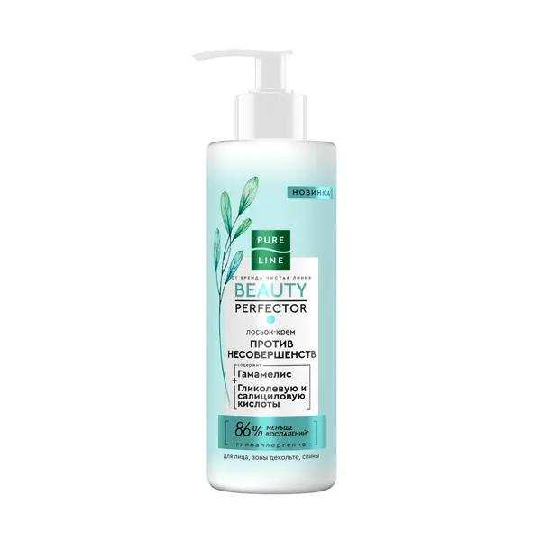 Если ваш привычный уход не справляется с несовершенствами и воспалениями на коже, попробуйте средства из новой серии Pure Line от бренда Чистая Линия. Первый шаг – очищение кожи пенкой с экстрактом гамамелиса и кислотами. Второй – нанесение на очищенную кожу лосьон-крема Beauty Perfector. ПРОДУКТ ДЕЙСТВУЕТ сразу в нескольких направлениях: • Без сухости и раздражения успокаивает и восстанавливает кожу; • Сокращает количество воспалений (86%)° и предотвращает появление новых. • Оказывает себорегулирующее действие. АКТИВНЫЕ ИНГРЕДИЕНТЫ: • Гликолевая и салициловая кислоты в эффективной концентрации 1,5% делают следы постакне менее заметными и предотвращают появление новых воспалений. • Экстракт гамамелиса снижает раздражение и обладает себорегулирующим эффектом. ЗОНЫ ПРИМЕНЕНИЯ: лицо, декольте, спина. Нанесите лосьон-крем на кожу лица и тела после ванны или душа, легко массируя до полного впитывания. Используйте 3-4 раза в неделю. Гипоаллергенно. Подходит для всех типов кожи: сбалансированной, комбинированной, жирной, сухой и чувствительной. Можно использовать подросткам с 14 лет. Клинически доказано: 86% – меньше воспалений°.