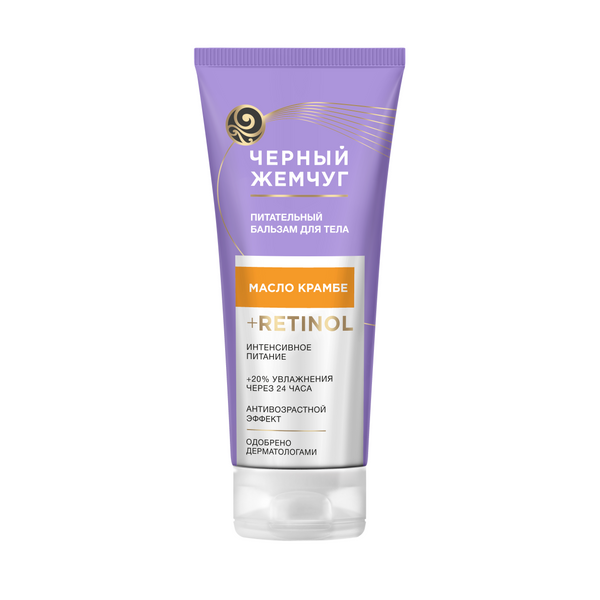 Бальзам для тела Питательный — новинка от бренда Черный Жемчуг, созданная специально для качественного ухода за кожей тела и заметного омоложения. Средство дарит питание и увлажнение для тела, оказывает антивозрастное действие, делает кожу шелковистой и эластичной. Управляйте возрастными изменениями и наслаждайтесь красивой кожей вместе с бальзамом для тела увлажняющим Черный Жемчуг: - Бальзам для увлажнения тела интенсивно питает кожу и придает ей эластичность. - Особая’ формула замедляет проявление признаков старения. - Средство сохраняет увлажненность кожи до 48 часов’’. - Клинически доказанный результат: +20% увлажнения даже через 24 часа’’! Формула бальзама обогащена маслом крамбе и ретинолом — ингредиентами с антивозрастным действием: - Масло крамбе с содержанием моно- и полиненасыщенных жирных кислот обладает высокой антиоксидантной активностью, ускоряет процессы восстановления кожи. - Ретинол участвует в восстановлении коллагенового матрикса и ускоряет обновление клеток кожи. Бальзам обладает приятной насыщенной текстурой, которая легко распределяется по телу и быстро впитывается. А изысканный аромат делает уход за собой еще приятнее. Средство одобрено дерматологами. Черный Жемчуг — эксперт в вопросах ухода за кожей и управления возрастом с 27-летней историей.