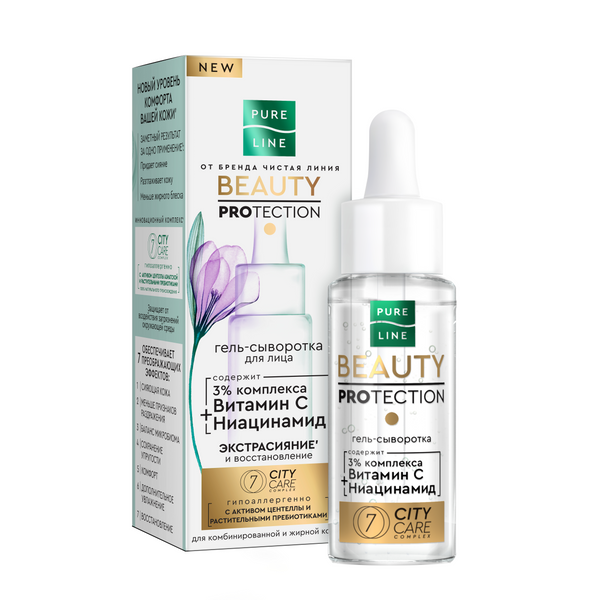 Новый уровень комфорта' вашей кожи с Pure Line от бренда Чистая Линия активирует ее естественные механизмы защиты! Гипоаллергенная гель-сыворотка разработана с учетом всех потребностей жирной и комбинированной кожи. Невесомая гелевая текстура легко впитывается и не оставляет жирной пленки. В составе продукта: • 3% комплекса с витамином С, который повышает эластичность, придает коже сияние и здоровый цвет, и ниацинамидом, улучшающим микроциркуляцию и снимающим раздражение; • Комплекс 7 CITY CARE 100% натурального происхождения с активом центеллы азиатской и растительными пребиотиками защищает от воздействия загрязнений окружающей среды и обеспечивает 7 преображающих эффектов: сияющая кожа, меньше признаков раздражения, баланс микробиома, сохранение упругости, комфорт, дополнительное увлажнение, восстановление. Уже после первого применения вы заметите*: сияющая, ровная кожа, жирный блеск сокращен. После того как используете гель-сыворотку, отправьте флакон в контейнер для пластика или вторсырья. Он пригоден для переработки.