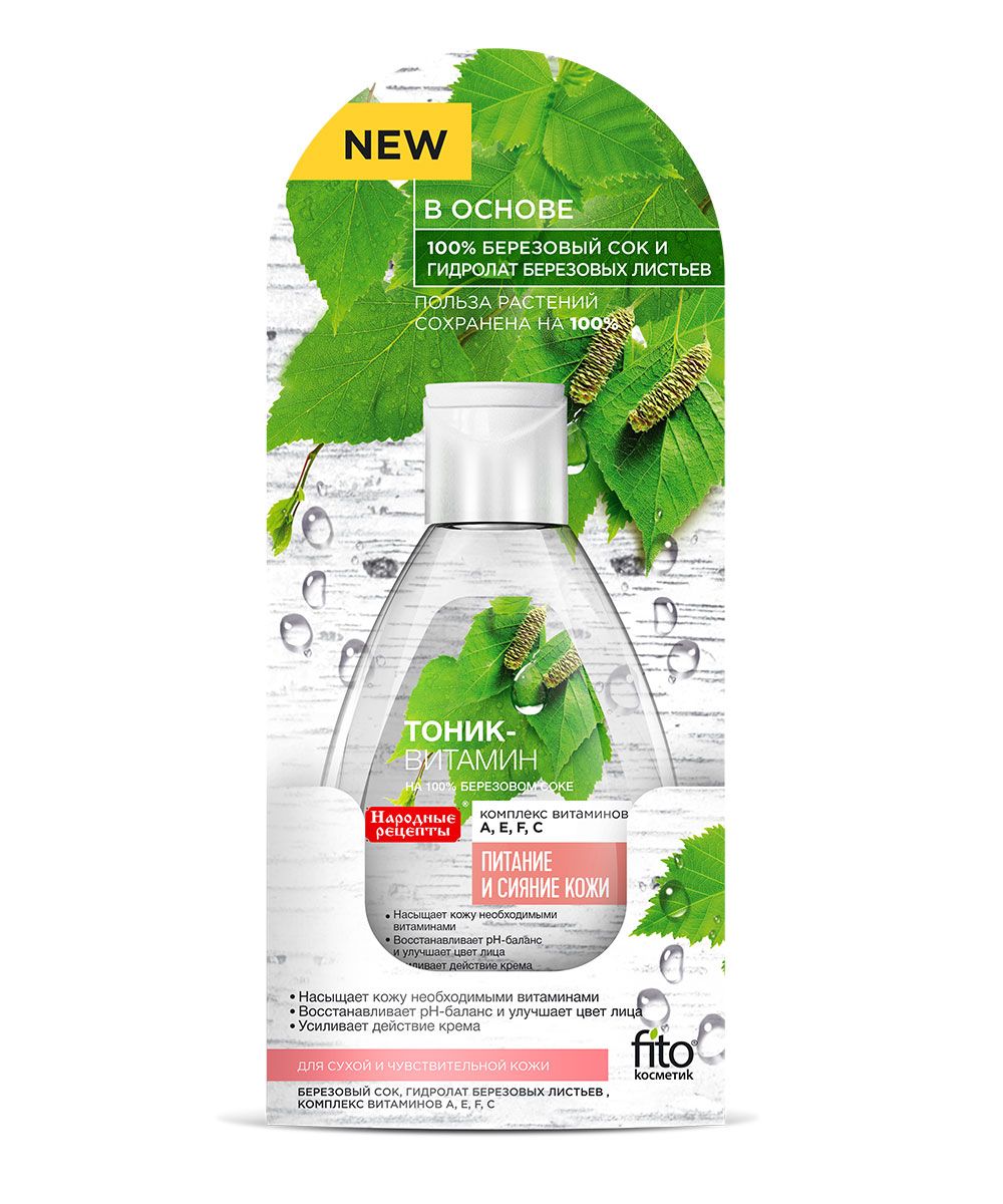 Тоник-витамин «Народные Рецепты» на 100% березовом соке и гидролате березовых листьев активно питает и увлажняет кожу, насыщает ее необходимыми витаминами А, Е, F, C. Тоник восстанавливает и смягчает кожу после умывания, подготавливает кожу к дальнейшему уходу и усиливает проникающую способность крема. Гидролат березовых листьев придает коже свежесть и гладкость, наполняя ее сиянием. Березовый сок является природным антиоксидантом, который защищает кожу и ухаживает за ней после применения декоративной косметики, восстанавливает естественный защитный слой. Тоник-витамин – это народный рецепт здоровой, чистой и красивой кожи!