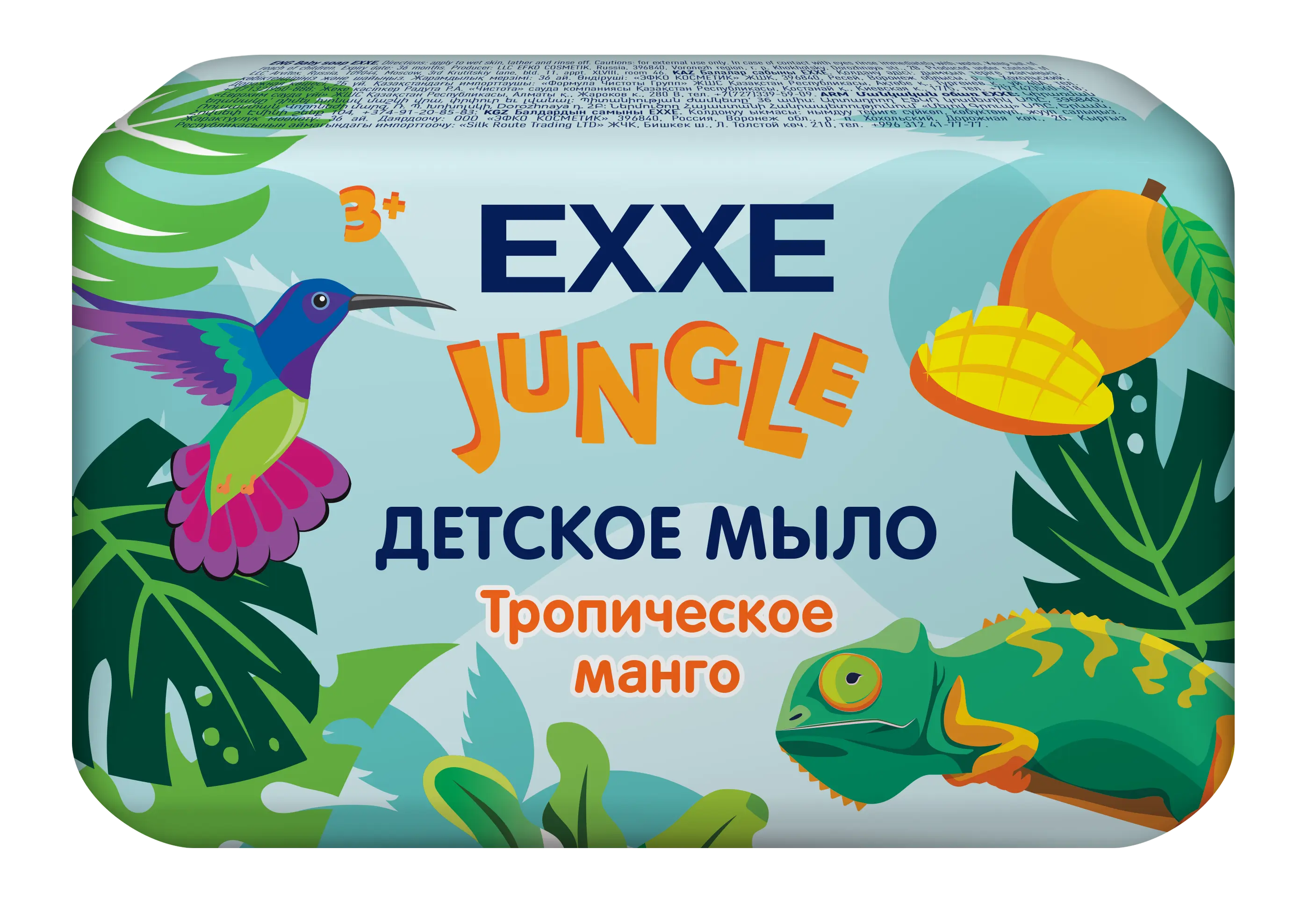 EXXE детская серия Джунгли Детское мыло "Тропическое манго". Растительная основа. Содержит глицерин, оливковое масло и гель алоэ. Хорошо пенится и мягко очищает кожу.