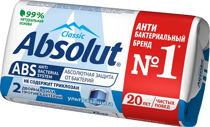 Твердое мыло Absolut "ABS комплекс" включает в себя 2 эффективных безопасных антибактериальных компонента.
