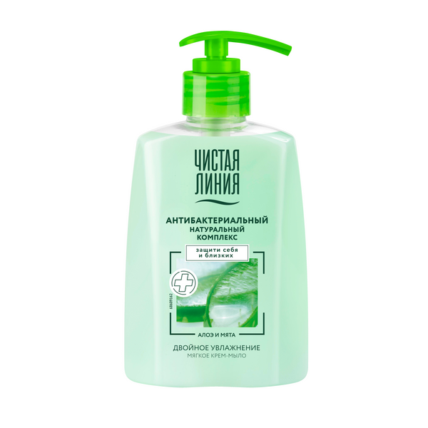 Кожа рук нуждается в надежном, но при этом нежном очищении. Крем-мыло Двойное увлажнение от бренда Чистая Линия содержит натуральный антибактериальный комплекс, эффективно очищает кожу от ежедневных загрязнений и оказывает антибактериальный эффект с заботой о коже. 100% натуральная основа1 мягкого крем-мыла помогает коже сохранять естественный водный баланс, обеспечивает бережный уход и увлажняет кожу. Сок алоэ и мята обладают противовоспалительными и увлажняющими свойствами, успокаивают кожу, делают ее мягкой, нежной и гладкой2. Благодаря природному полисахариду – инулину в составе, кожа рук дополнительно защищена от потери влаги во время очищения. Уровень pH родственный коже. Одобрено дерматологами. Защитите себя и близких! Будьте уверены в чистоте рук и их бережном очищении вместе с крем-мылом Двойное увлажнение от бренда Чистая Линия.