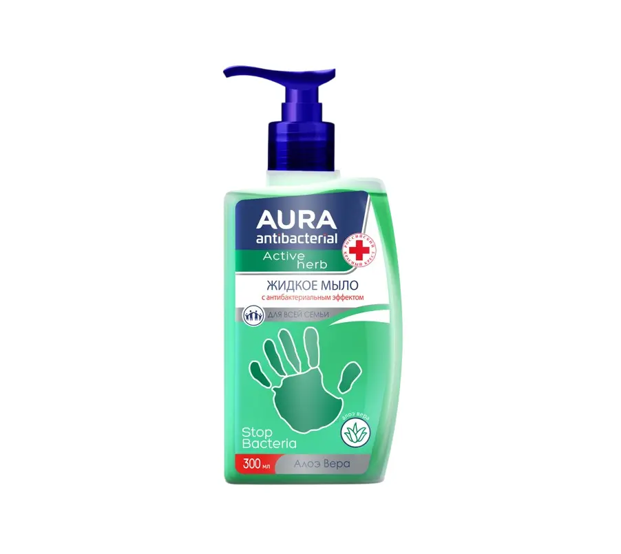 Жидкое мыло для всей семьи с антибактериальным эффектом AURA Active Herb с Алоэ Вера бережно очищает кожу рук, обеспечивая эффективное удаление с кожи загрязнений и бактерий, сохраняя при этом естественный липидный баланс. Натуральный экстракт Алоэ Вера оказывает тонизирующее действие и антибактериальный эффект, а также интенсивно увлажняет и успокаивает кожу, повышая ее эластичность.