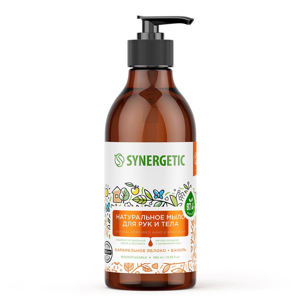 Натуральное биоразлагаемое мыло для рук и тела SYNERGETIC "Карамельное яблоко и ваниль" - это деликатное средство для очищения кожи с высокой концентрацией натуральных компонентов в составе. Гипоаллергенный аромат натурального мыла разработан в швейцарском доме Givaudan с использованием натуральных эфирных масел померанца, корицы и лимона. Масла макадамии, гранатовых косточек и экстракты ванили и яблока оказывают регенерирующее действие, питают и увлажняют сухую кожу, делая ее гладкой и бархатистой. Мультифункциональный компонент натурального происхождения софоролипид мягко очищает и сохраняет естественный микробиом кожи. Уникальный комплекс натуральных компонентов обеспечивает длительный смягчающий эффект до 72 часов. Физиологичный уровень pH 5,5 гарантирует мягкость кожи и безопасность при частом использовании даже для чувствительной кожи. Мыло дерматологически протестировано независимым исследовательским институтом Dermatest®️ в Германии. Средство не содержит SLS, силиконов, минеральных масел, красителей и компонентов животного происхождения, не тестируется на животных и сертифицировано британской организацией The Vegan Society. Знак Vegan – мировой стандарт этичной продукции.