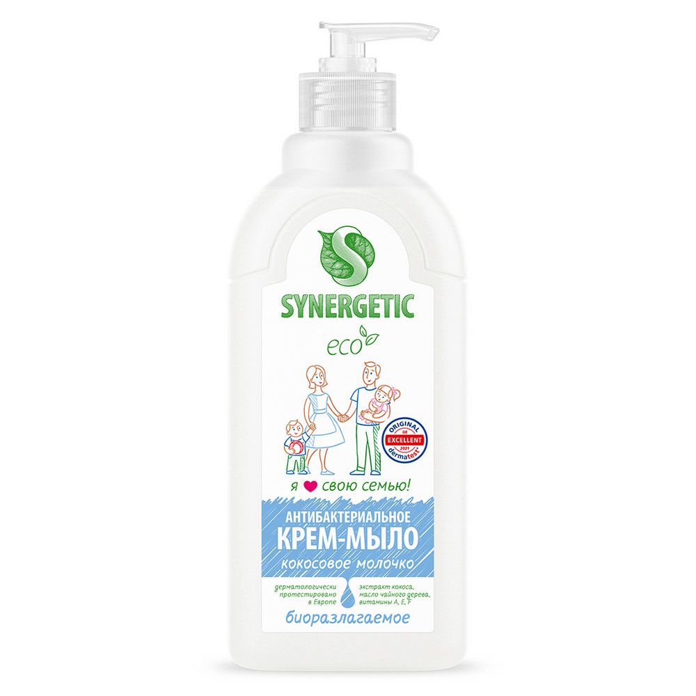 Антибактериальное увлажняющее жидкое крем-мыло SYNERGETIC "Кокосовое молочко" эффективно очищает кожу от любых загрязнений и запахов даже в холодной воде. Комбинация растительных К-тензидов, морской соли и натуральных эфирных масел чайного дерева, эвкалипта и тимьяна обеспечивает длительный антибактериальный эффект с защитой от микроорганизмов на 99,9%. Экстракт кокоса и растительный глицерин интенсивно увлажняют кожу. Комплекс витаминов A, E, F повышает сопротивляемость кожи неблагоприятному воздействию внешней среды. Мультифункциональный компонент натурального происхождения софоролипид мягко очищает и сохраняет естественный микробиом кожи. Гипоаллергенное средство подходит для чувствительной кожи. Мыло дерматологически протестировано независимым исследовательским институтом Dermatest®️ в Германии. Биоразлагаемые компоненты безопасны для природы и человека и не вредят микрофлоре септических установок при использовании средства в соответствии со способом применения.