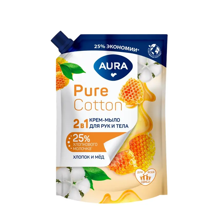 Aura pure cotton жидкое мыло 2 в1 для рук и тела хлопок и мёд дой пак 450 мл