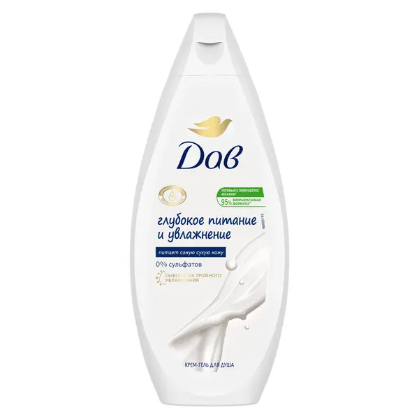 Ухоженная и увлажненная кожа сразу после душа? Да! С крем-гелем Глубокое питание и увлажнение от Dove. Увлажняющая формула с сывороткой тройного увлажнения глубоко**** питает даже самую сухую кожу. Содержит очищающие компоненты из природного сырья и увлажняющий компонент растительного происхождения. 0% сульфатов SLES (содиум лаурет сульфат). Гель для душа Dove создает пышную пену и бережно очищает кожу. Крем-гель обладает роскошным уходовым ароматом, благодаря которому обычный прием душа станет небольшим спа-ритуалом и временем, посвященным себе и своей красоте. Результат: мягкая, увлажненная кожа за 1 применение.