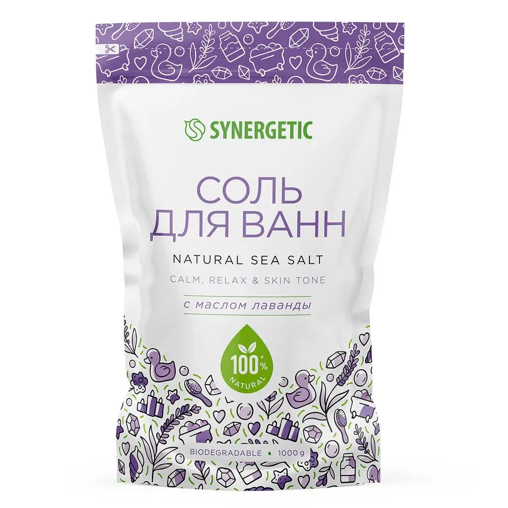 Натуральная морская соль для ванн SYNERGETIC с маслом лаванды бережно очищает и улучшает состояние кожи, а бисаболол интенсивно питает, делая ее гладкой и шелковистой. Солевые ванны способствует уменьшению проявлений целлюлита, успокаивают и восстанавливают барьерные функции кожи. Ванны с морской солью способствуют восстановлению защитных сил организма, а нежный аромат лаванды помогает расслабиться и улучшает настроение. Морская соль состоит из хлорида натрия, поэтому она имеет соленый привкус. Помимо этого в ней содержится сульфат магния, кальция и калия, а также йод, фтор и еще множество полезных для организма минералов. Благодаря отсутствию химической и высокотемпературной обработки все они сохраняются в неизменном природном виде. Теплая ванна с морской солью SYNERGETIC - это прекрасный способ восстановить силы и насытить организм полезными веществами.