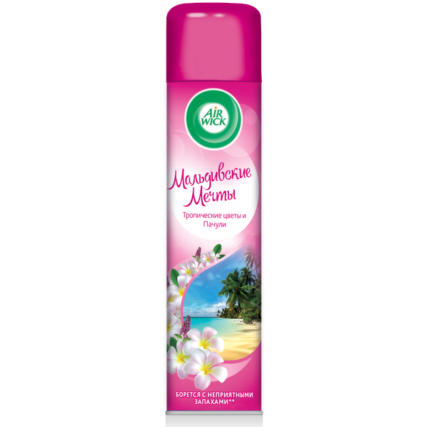 Аэрозоль-освежитель воздуха Air Wick Мальдивские мечты из новой коллекции Ароматы мира* эффективно борется с неприятными запахами**, создавая романтическое настроение с легкими освежающими ароматами тропических цветов и пачули. *На рынке с августа 2019 **На основании отчета Рекитт Бенкизер от 12.10.2018 (г. Халл, Великобритания)