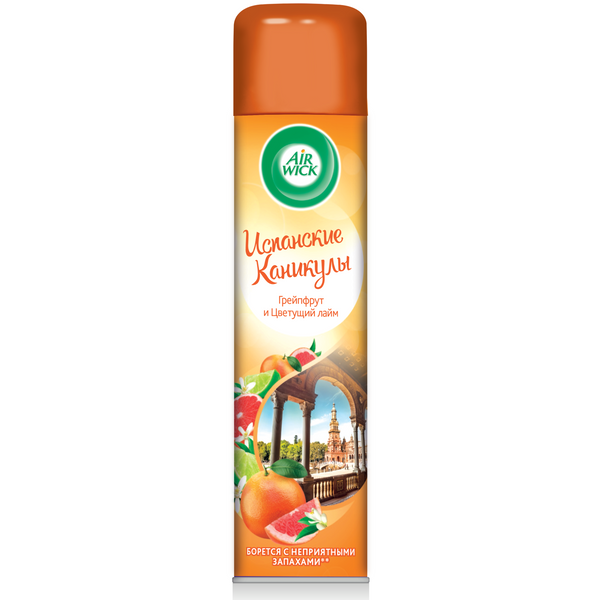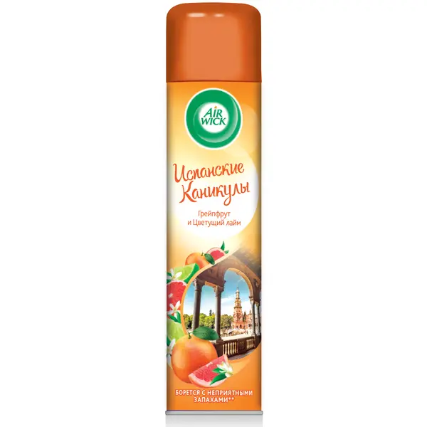 Аэрозоль-освежитель воздуха Air Wick Каникулы в Испании из новой коллекции Ароматы мира эффективно борется с неприятными запахами, создавая заряд солнечного настроения Испании с цитрусовыми ароматами грейпфрута и цветущего лайма.