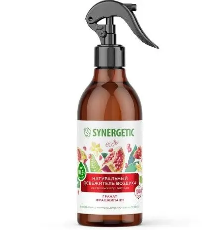 Биоразлагаемый освежитель воздуха, нейтрализатор запахов SYNERGETIC "Гранат и франжипани" на водной основе - это безопасная формула с высокой концентрацией натуральных компонентов. Парфюмерная композиция с натуральными эфирными маслами наполняет воздух свежим ароматом спелого граната с тропическими нотами.