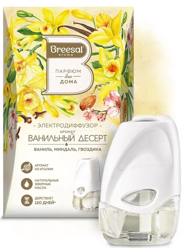 Электрический диффузор для ароматизации воздуха в помещении Breesal + Сменный флакон с ароматической жидкостью для электрического диффузора Breesal: "Ванильный десерт".Назначение: для устранения неприятных запахов, освежения и ароматизации воздуха жилых помещений, ванных и туалетных комнат