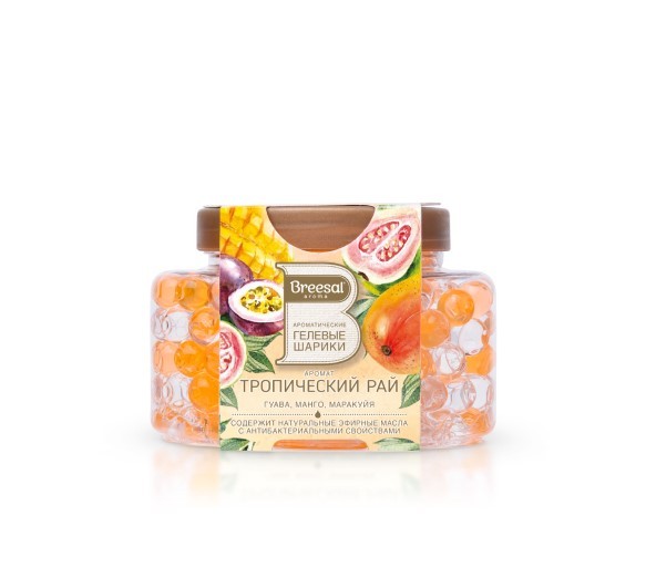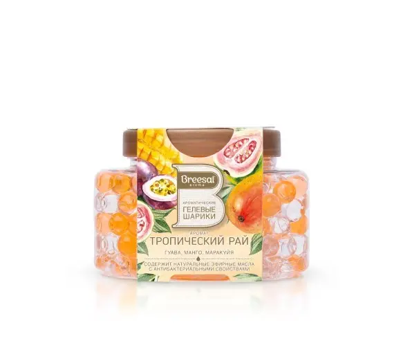 Ароматические гелевые шарики с тропическим ароматом сладкого сочного манго, экзотическими нотами маракуйи и гуавы. Шарики объемом 160 г. Качесвенная парфюмерная отдушка из Франции содержит натуральные эфирные масла обладающие антибактериальными свойсвами. Золотая резная крышка.