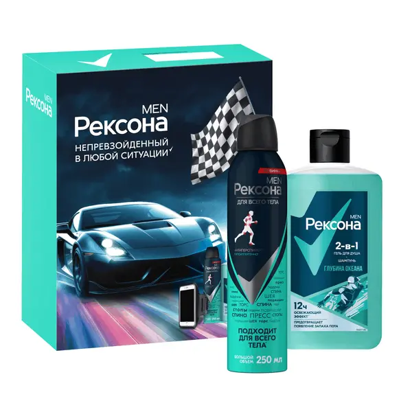Подарочный набор мужчине Рексона MEN Энергия Уверенности представляет собой мужественную коллекцию средств для ежедневного ухода за волосами и телом у мужчин. В состав набора входят гель для душа и шампунь для волос 2в1, дезодорант-антиперспирант мужской спрей, спортивный чехол для телефона – незаменимые средства для тех, кто ценит высокий уровень ухода за собой и стремится к комфорту во всем. Средства упакованы в элегантную подарочную коробку, что делает этот комплект идеальным подарком. Гель для душа и шампунь для волос мужской 2в1 разработан на основе специальной* формулы с пребиотическим' 3х комплексом, который включает в себя глицерин, инулин и молочную кислоту. Технология усиленной* защиты от пота и запаха, входящая в уходовую формулу продукта, предотвращает появление запаха пота в течение 12 часов**. Средство деликатно очищает волосы, кожу головы и тела, оставляя после себя стойкий мужественный аромат на основе древесно-мускусной базы, который окутывает приятной прохладой. Гель для душа мужской парфюмированный обеспечивает эффективное очищение, увлажнение и смягчение кожи без сухости и раздражений**. Дезодорант мужской спрей создан для защиты всего*** тела от пота и запаха. Средство разработано на основе уникальной* формулы, которая подходит и одинаково эффективна для всего*** тела и комфортна для кожи. Антиперспирант мужской спрей не содержит в составе этилового спирта не вызывает раздражения после нанесения. Он не оставляет липкости, белых следов и пятен после нанесения****. А его цитрусовый аромат лайма с нотками зелени и морской соли раскрывается на коже постепенно, даря ощущение прохлады и бодрости.