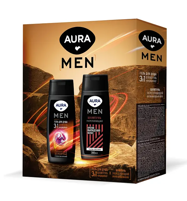 Подарочный набор aura men гель для душа энергия спорта 250 мл шампунь для волос укрепляющий 250 мл