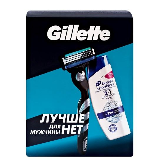 Набор подарочный мужской GILLETTE Mach3 Бритва, 1 сменная кассета+Шампунь HEAD&SHOULDERS Основной уход, против перхоти подойдет каждому мужчине. Лезвия прочнее, чем сталь, дольше остаются острыми. Смазывающая полоска скользит по коже, предотвращая ее покраснение. Защитный микрогребень SkinGuard растягивает кожу и подготавливает волоски к срезанию для защиты кожи от порезовa. Шампунь – средство от перхоти 2 в 1 эффективно очищает кожу головы и волосы, увлажняя их и придавая им ощущение свежести