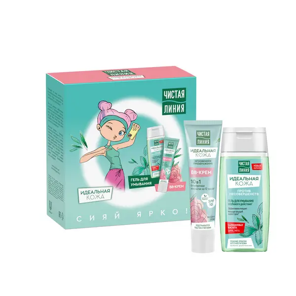 Первый и один из самых важных шагов на пути к идеальной коже – качественное очищение, соответствующее типу кожи. Специально для молодой кожи эксперты бренда Чистая Линия разработали гель для умывания глубокого действия' Идеальная кожа. Он эффективно очищает и действует целенаправленно против несовершенств кожи. Прыщей становится меньше уже через 3 дня!* Всего один продукт - и твоя кожа вновь сияет чистотой и свежестью! Состав геля для умывания идеально подходит для решения проблем твоей кожи: цинк нормализует выработку себума; салициловая кислота регулирует отшелушивание и обновление поверхностного слоя кожи; экстракт перечной мяты тонизирует и освежает кожу. Сразу после умывания ты почувствуешь, что кожа очищена без сухости и стянутости, готова к тонизированию и увлажнению. Специально для ровного и сияющего тона лица эксперты бренда Чистая Линия разработали ВВ-крем 10 в 1 Идеальная кожа. Гарантированное безупречное покрытие на 12 часов2. Его невесомая текстура со светоотражающими частицами мгновенно преображает кожу. Экстракт розы увлажняет и улучшает цвет лица. Растительные1 и минеральные пигменты выравнивают тон и матируют. Защищает от UV-лучей благодаря SPF 10. Ровно наносится и подстраивается под любой тип и тон кожи без эффекта маски.